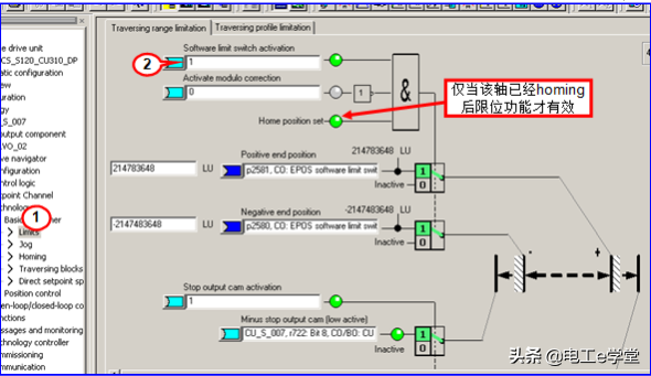 S120中包含两种限位功能:软限位、硬限位。以限制轴运行范围。同时还有对轴运行速度,加减速的限制。