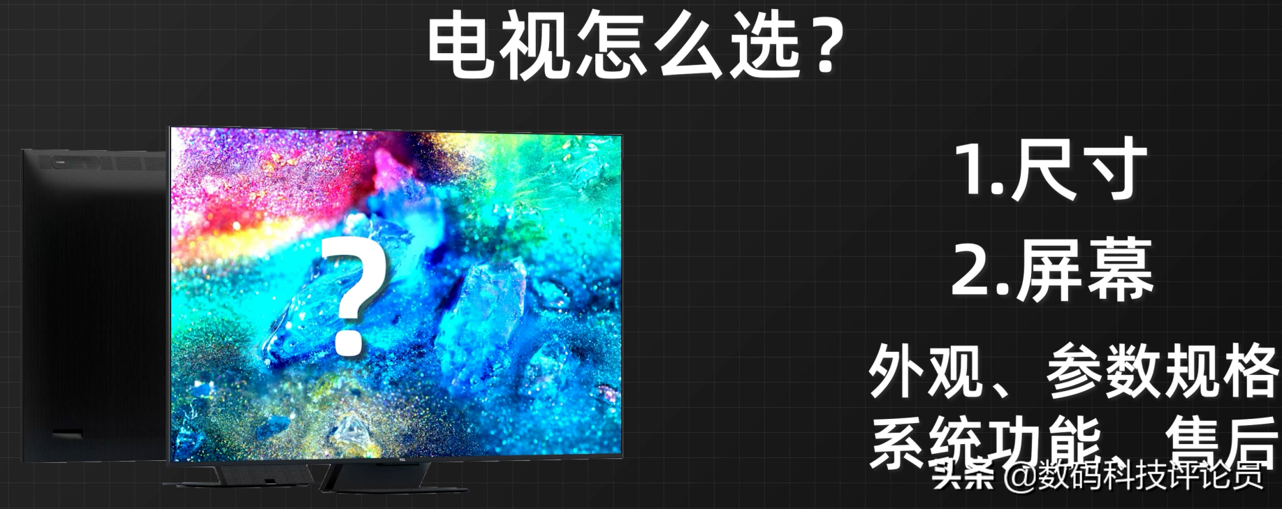 那么今天我们就来为大家详细评测一台来自TCL的X1175寸QD-MiniLED电视。那么怎么理解这台X1175寸QD-MiniLED电视呢?首先尺寸上是75寸的大屏,面板技术上是QD-MiniLED的材质,后面我再来给大家详解这个QD-MiniLED材质。关于电视怎么选?其实我最注重两点,一个是尺寸,另外一个就是屏幕。其次才是那些外观、参数规格、系统功能、售后等等。