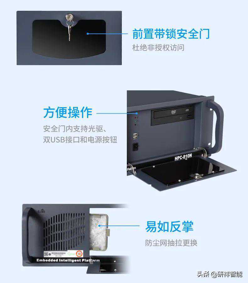HPC-810N前置带锁安全门,防止非法操作和访问,内置电源开关、状态指示灯、2个USB,方便临时运维。防尘网可一键抽拉,方便清洗和更换。