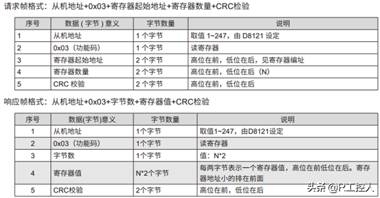 2.Modbusrtu通过不同功能码对相应单个线圈/多个寄存器进行读写,例如使用0x03功能码读取多个保持型寄存器数据,发送数据及返回数据格式如下: