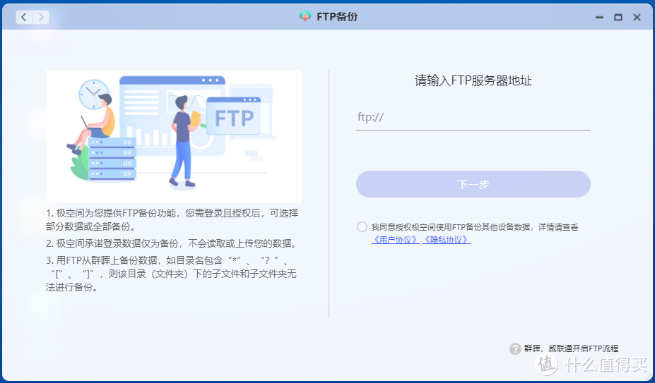 如果之前家里有其他品牌的NAS,可以使用“FTP备份”这个套件,通过FTP协议把旧NAS中的文件拷贝到极空间: