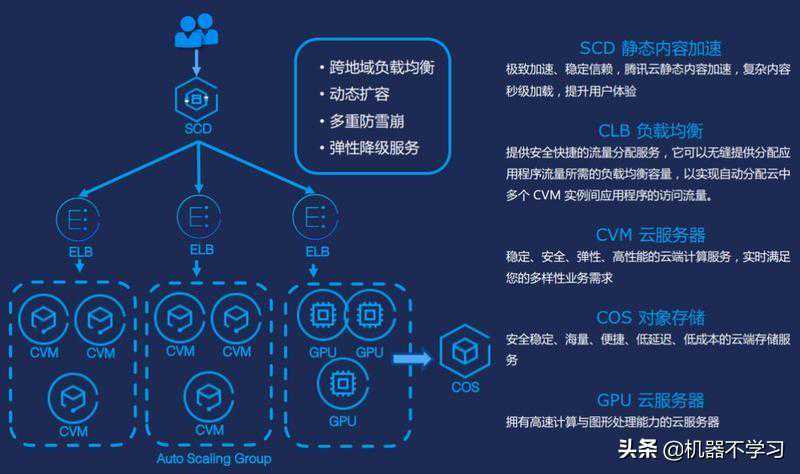 下图是腾讯云的方案矩阵。大概分几个不同的领域:人脸(计算机视觉)。这个里面包括人脸和声,身份证识别,还有各种基于场景的,比如智能门禁物;语音领域,我们也有ASR(语音-文字)和TTS(文字-语音)的能力。底层有机器学习的平台和大数据的平台去支撑。基础建设就包括我们刚才提到的CPU、GPU,还有FPGA的各种服务器。