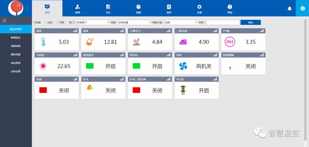 温度、湿度的测量记录和卷帘、滴灌等设备的自动化控制,实现农机和农艺的有机结合。从而大幅度提高温室生产的技术水平,协助推进设施农业向精品、高端、高效方向发展。