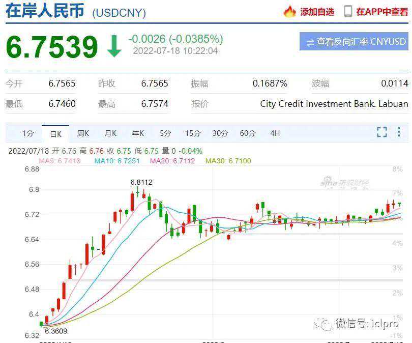 5.本周在岸人民币对美元汇率大幅贬值,截止7月18日,在岸人民币对美元汇率报6.7536,同比上周一收盘价6.7180,贬值356个基点