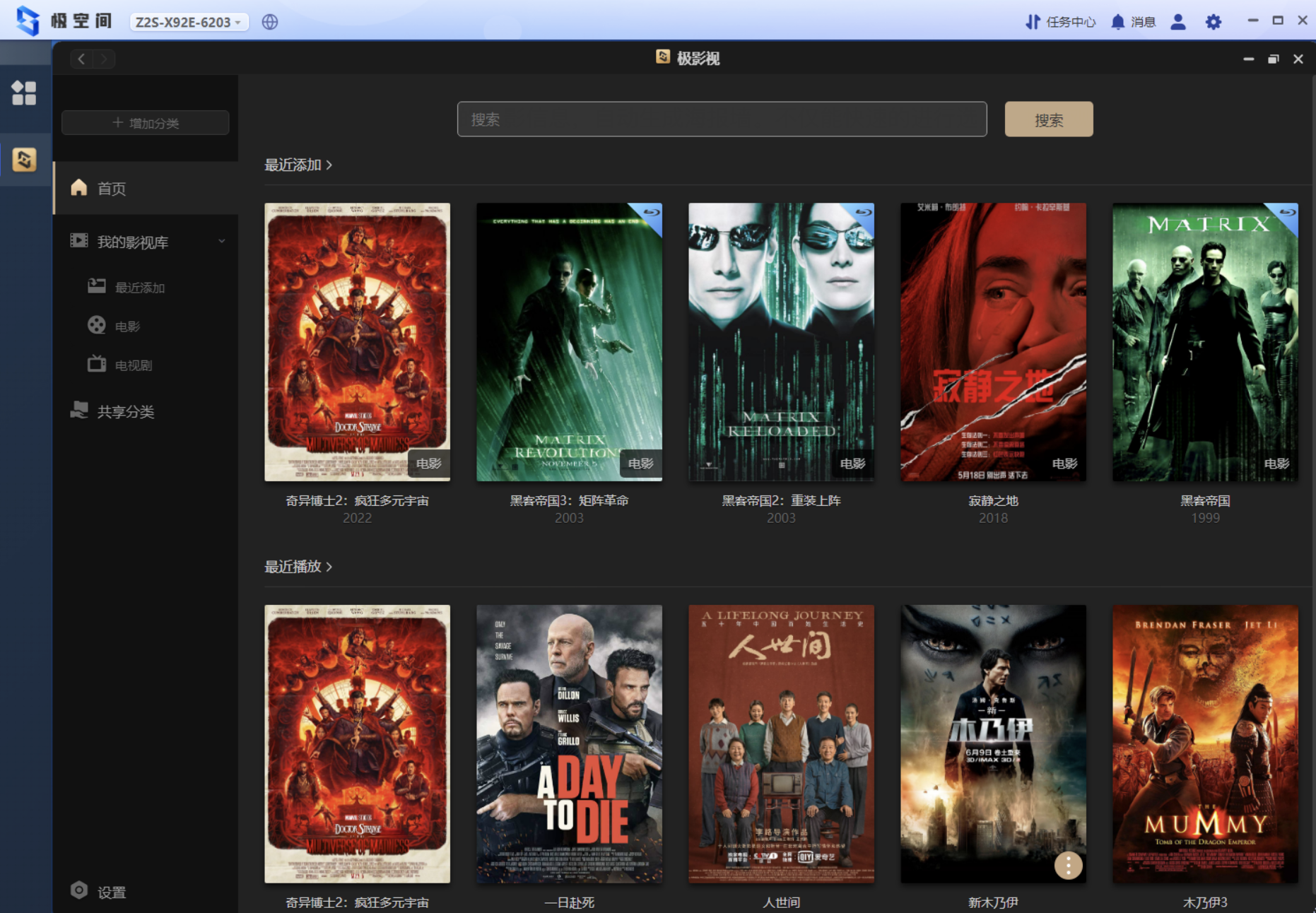 在极影视那边就可以按之前的步骤来添加电影了,添加完成后也是可以自动识别出来海报墙的,我框出来的这三个文件夹都是我威联通里的内容。