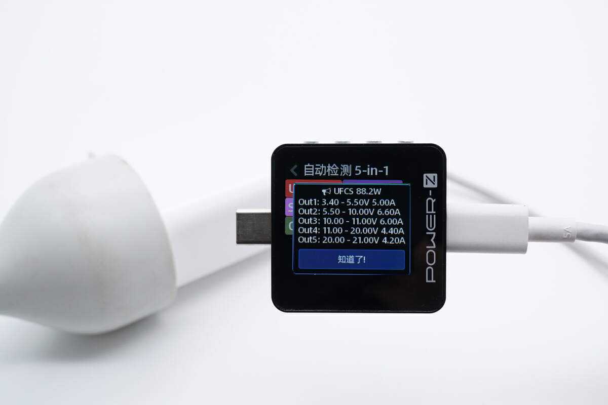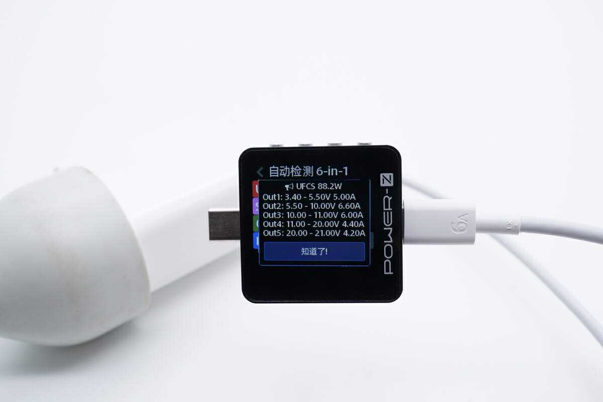 单独进行测试时,可读取USB-C端口的UFCS快充协议电压档位,华为88W全能充电器USB-A端口支持3.4-5.5V5A、5.5-10、10-11V6A、11-20、20-21五组UFCS快充档位