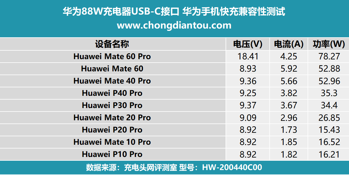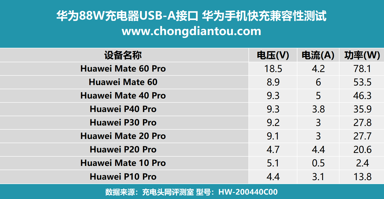 将数据汇总至表格,可以看出华为88W充电器为华为手机充电握手18V、9V电压档位,其中功率最高的是华为Mate60Pro,握手18V电压,功率达到了78.27W。