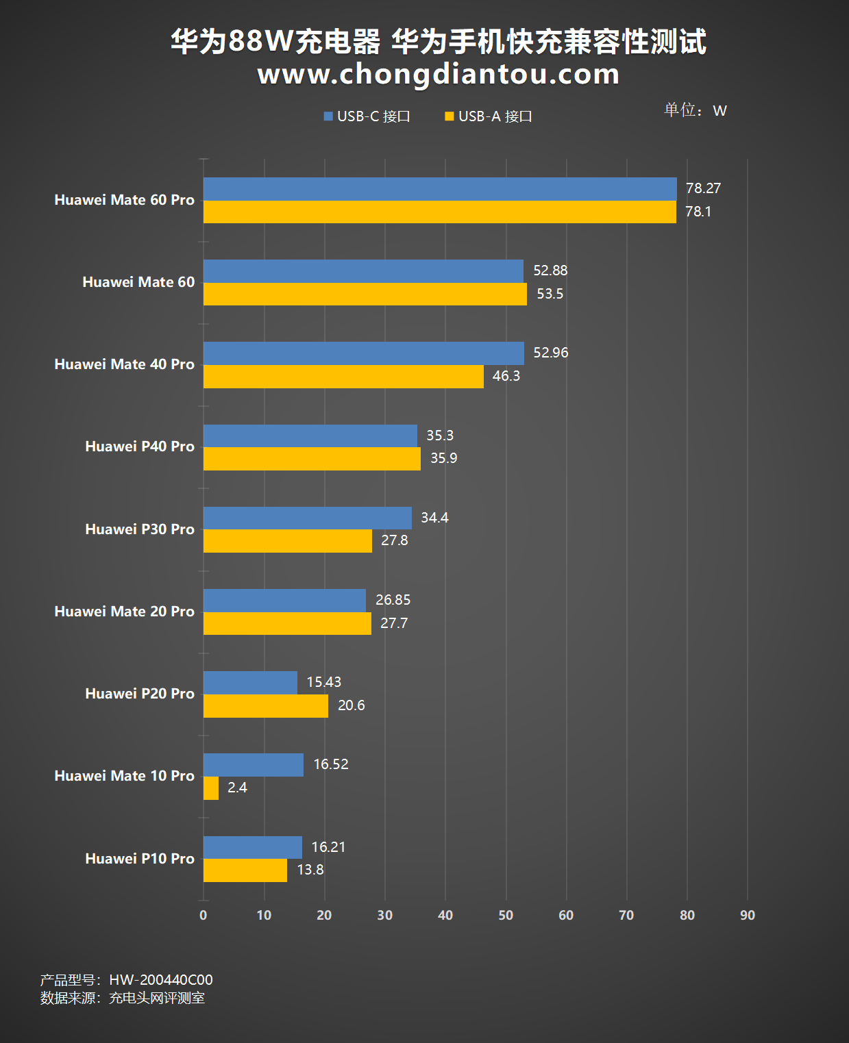 将测试数据绘制成柱状图,可以清楚看出为华为88W充电器两个接口USB-C、USB-A接口,为华为手机充电功率差异基本不大,除了华为Mate10ProUSB-A接口异常外。