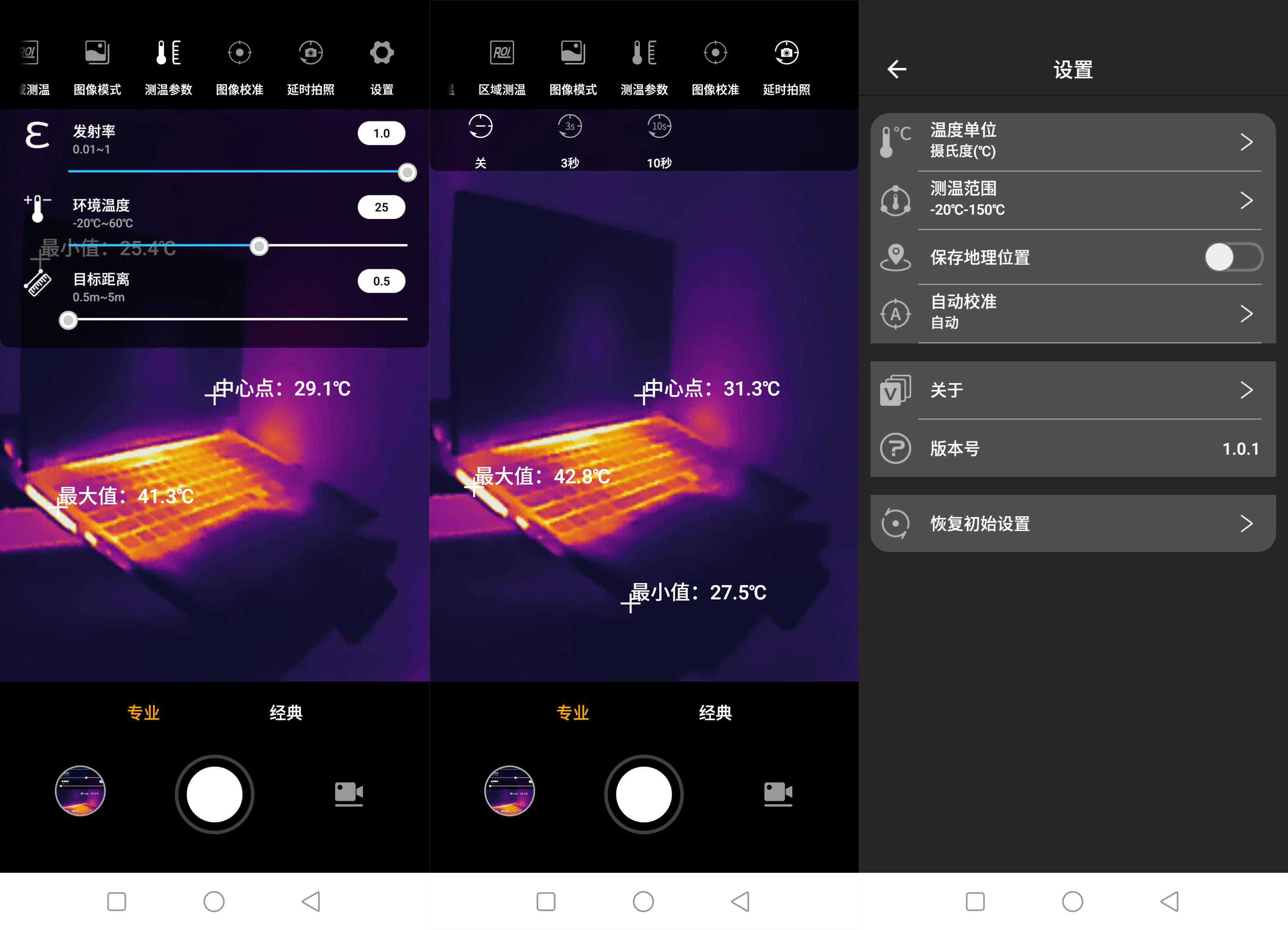 ▲当然,也可以选择经典模式,涉及的内容则包括色板、延时拍照、整帧测温和设置。