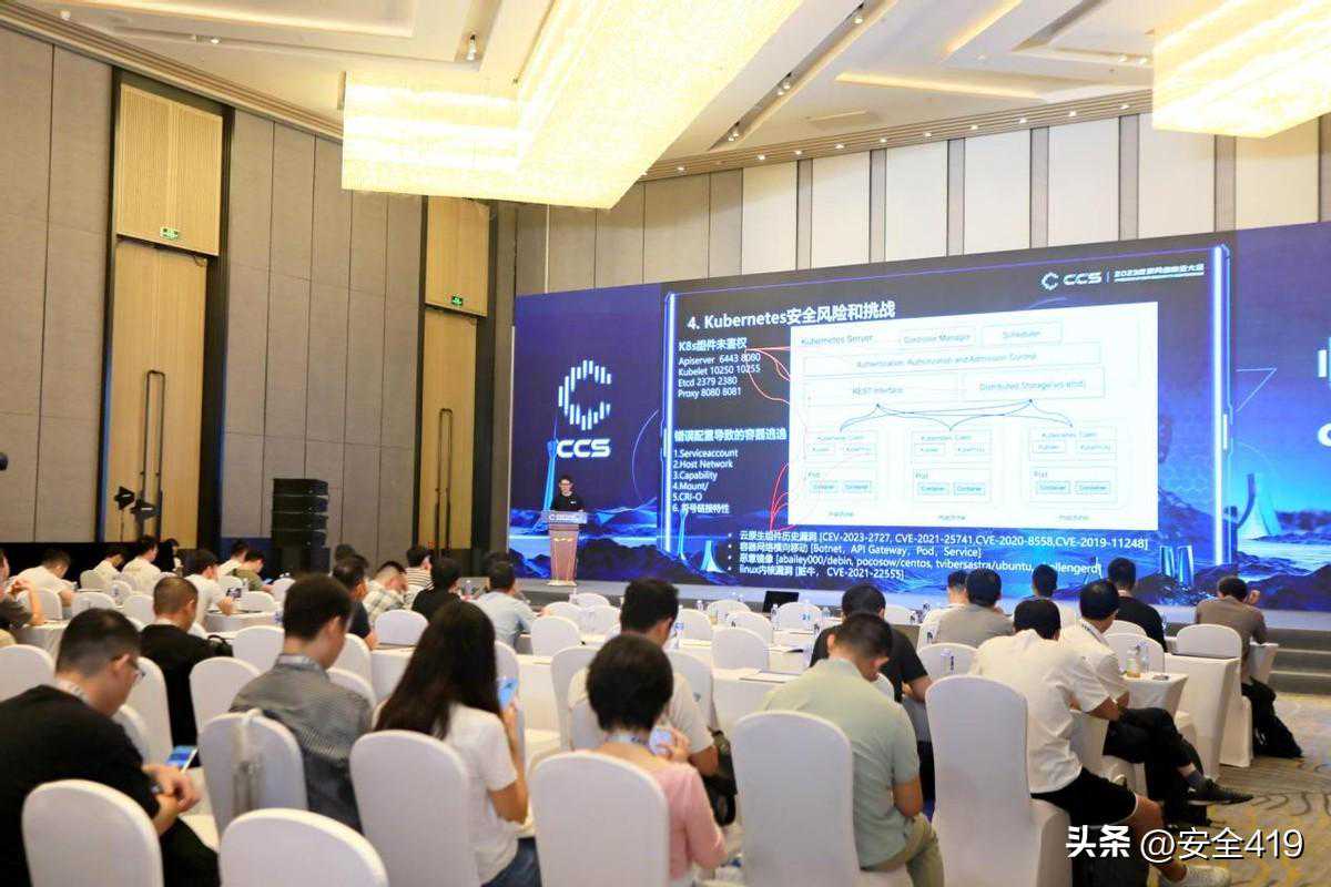 最后一位演讲嘉宾戴梦洁来自蚂蚁集团的网商银行,分享了《从0到1打造K8s威胁检测可信纵深体系》议题。他从六个方面分享了自己的研究成果,包括数字银行面临的K8s威胁与挑战、业界保护方案和应对现状、网商银行采用的可信纵深威胁检测体系的从无到有、大模型在智能化检测中的应用以及对K8s安全的展望。