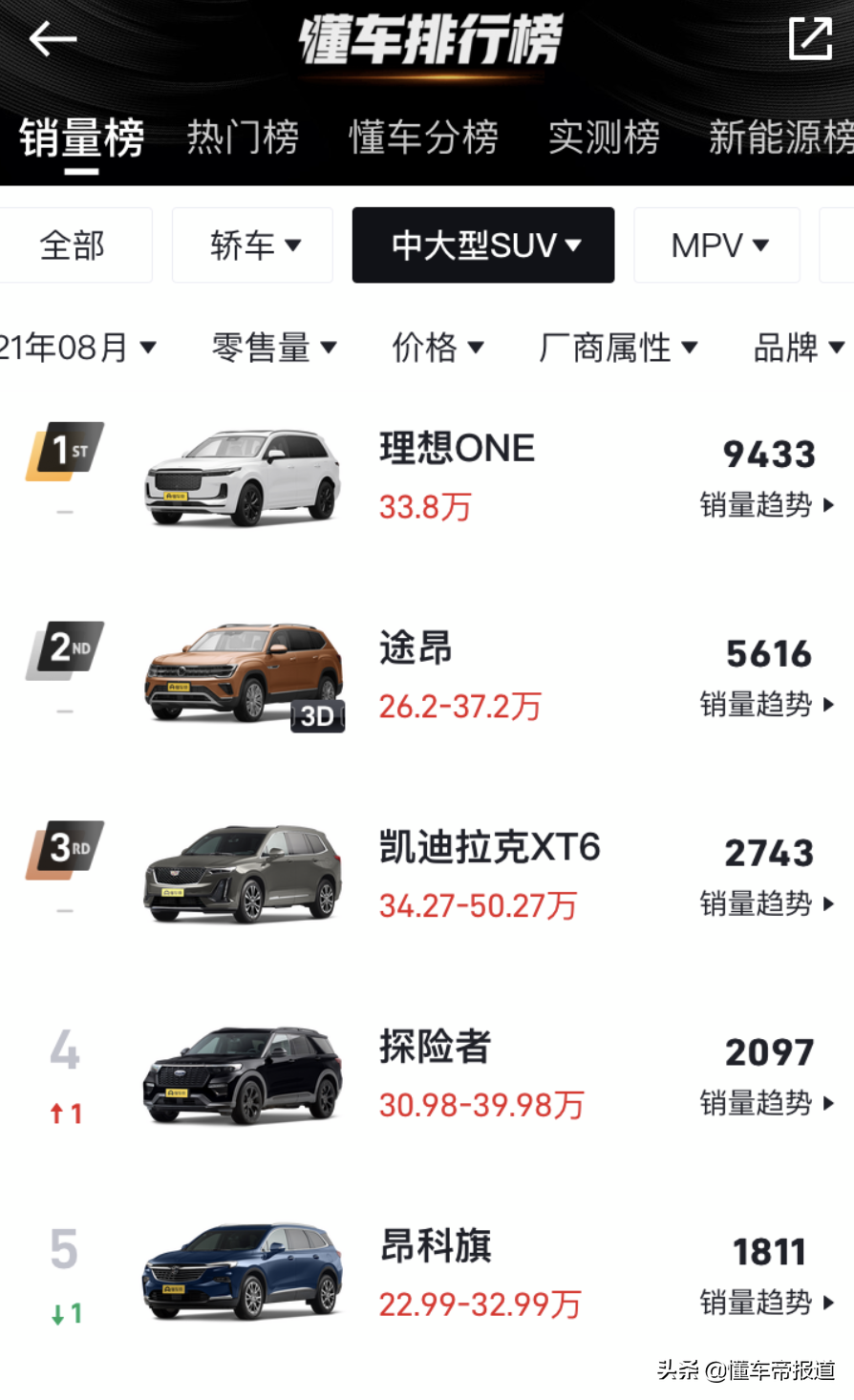 8月国内中大型SUV销量榜