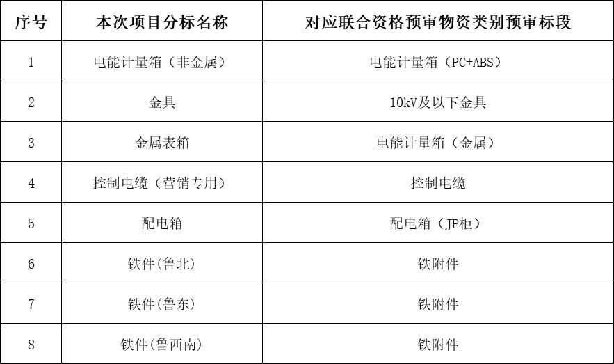 本次招标项目电能计量箱(非金属)、金具、金属表箱、控制电缆(营销专用)、配电箱、铁件(鲁北)、铁件(鲁东)、铁件(鲁西南)共8个分标已由国家电网公司组织联合资格预审(国家电网有限公司2019年度省公司二级采购目录招标采购联合资格预审-2018年12月24日发布预审公告,以下简称“联合资格预审”),通过联合资格预审相应物资类别的申请人方有资格参加相应分标的投标。(分标名称与联合资格预审物资类别预审标段对应关系详见下表)