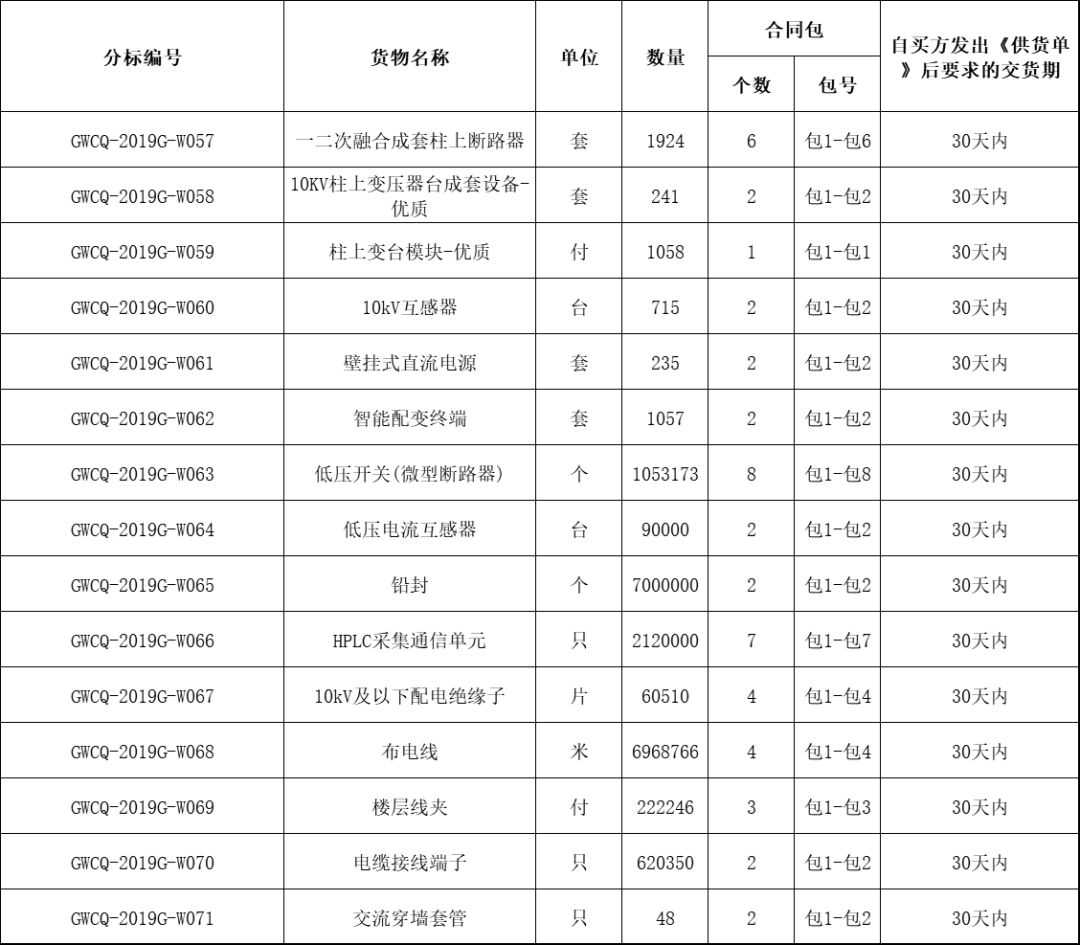 注:(1)本次招标所含项目中,W063低压开关(微型断路器)、W066HPLC采集通信单元有最高限价。(2)W057一二次融合成套柱上断路器,招标的范围分别包含相应硬件、软件的供货及其集成、运输、安装、调试、检测、培训等服务。