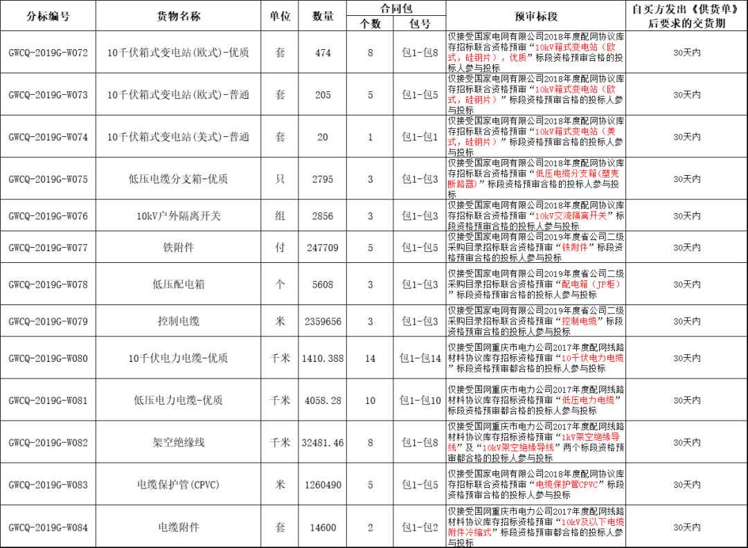 国网重庆市电力公司2019年第一次配网物资协议库存招标采购