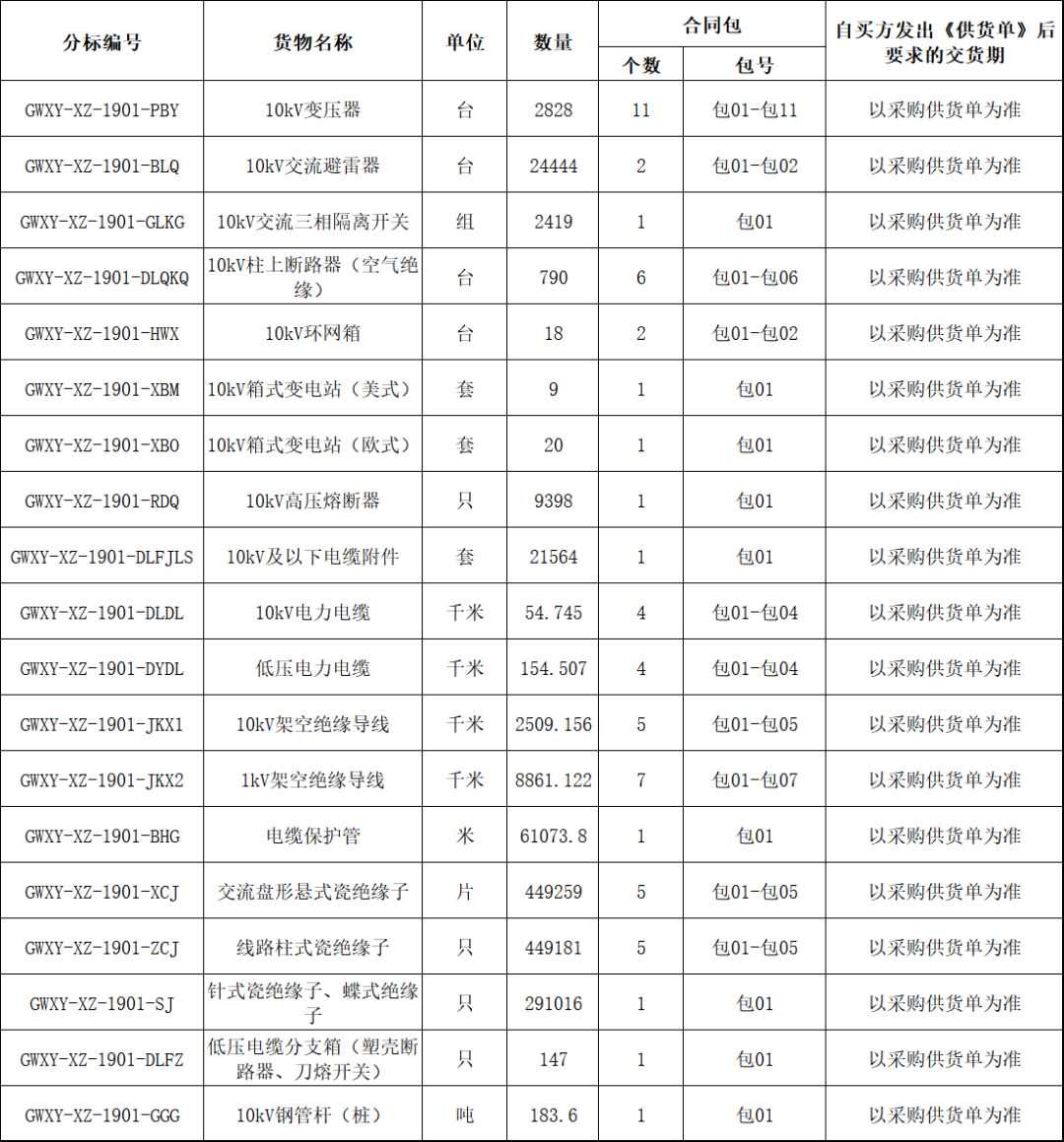 国网西藏电力有限公司2019年第一次配网物资协议库存招标采购项目