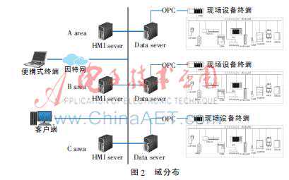 从图11可以看出,该系统的HMI和Data服务器是在一台计算机上的SLC500处理器,通过现场总线扫描每个子站以及子站下面挂设的终端信息,最终通过OPC提交给DataSever,HMISever再从DataSever获取数据信息进行数字化图形显示。最后客户端再在局域网内与HMISever交互,最终操作员、工程师可以获取现场设备信息,如再增加VPN通信,便可顺利地实现远程通信、诊断、监控。