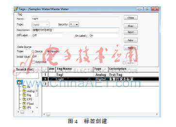 标签是所有开发的基础,HMI从DataSever获得现场数据以后以标签的形式实现现场数据与标签的一一对应关系,图形的相应动作也是根据标签值来实现的。标签的创建如图4所示。