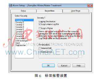 标签报警是标签数据异常的反映,当标签值超过警将发生,并将异常值写入故障数据库,趋势图将根据数据库中的数据绘制故障趋势,通过趋势图生产管理者就可以得出一些结论,例如:通过温度趋势图,管理者就可以发现什么温度容易导致设备故障,或者生产效能低下,这样便可以指导将来的设备改造。图6是标签报警设置界面。