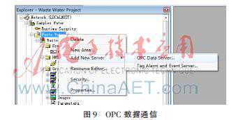 图8中OPC服务器和数据服务器采用的是OPC的通信方式。下面简要介绍OPC。OPC是用于过程控制的一个工业标准,它是包括一整套接口、属性和方法的标准集,用于过程控制和制造业自动化系统。它的出现为基于Windows的应用程序和现场过程控制应用建立了桥梁[2]。在过去,为了存取现场设备的数据信息,每一个应用软件开发商都需要编写专用的接口函数。由于现场设备种类繁多,且产品不断升级,往往给用户和软件开发商带来了巨大的工作负担。通常这样也不能满足工作的实际需要,系统集成商和开发商急切需要一种具有高效性、可靠性、开放性、可互操作性的即插即用的设备驱动程序。因此,OPC标准应运而生。