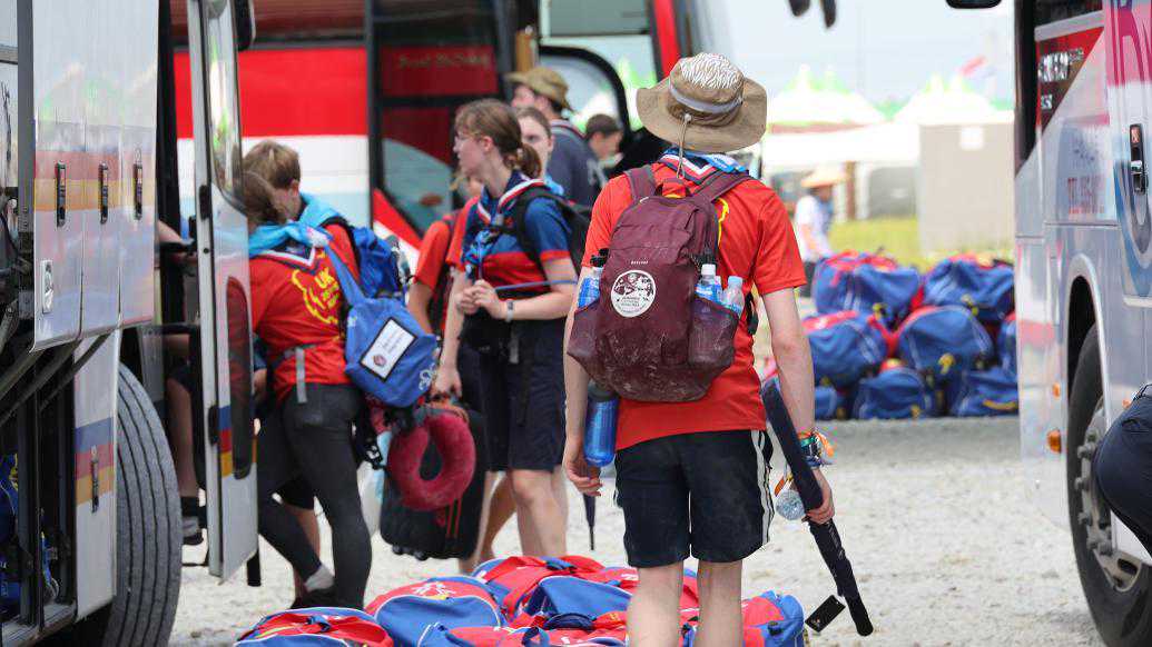 当地时间2023年8月5日,韩国全罗北道,英国童子军们正在往巴士上装行李。