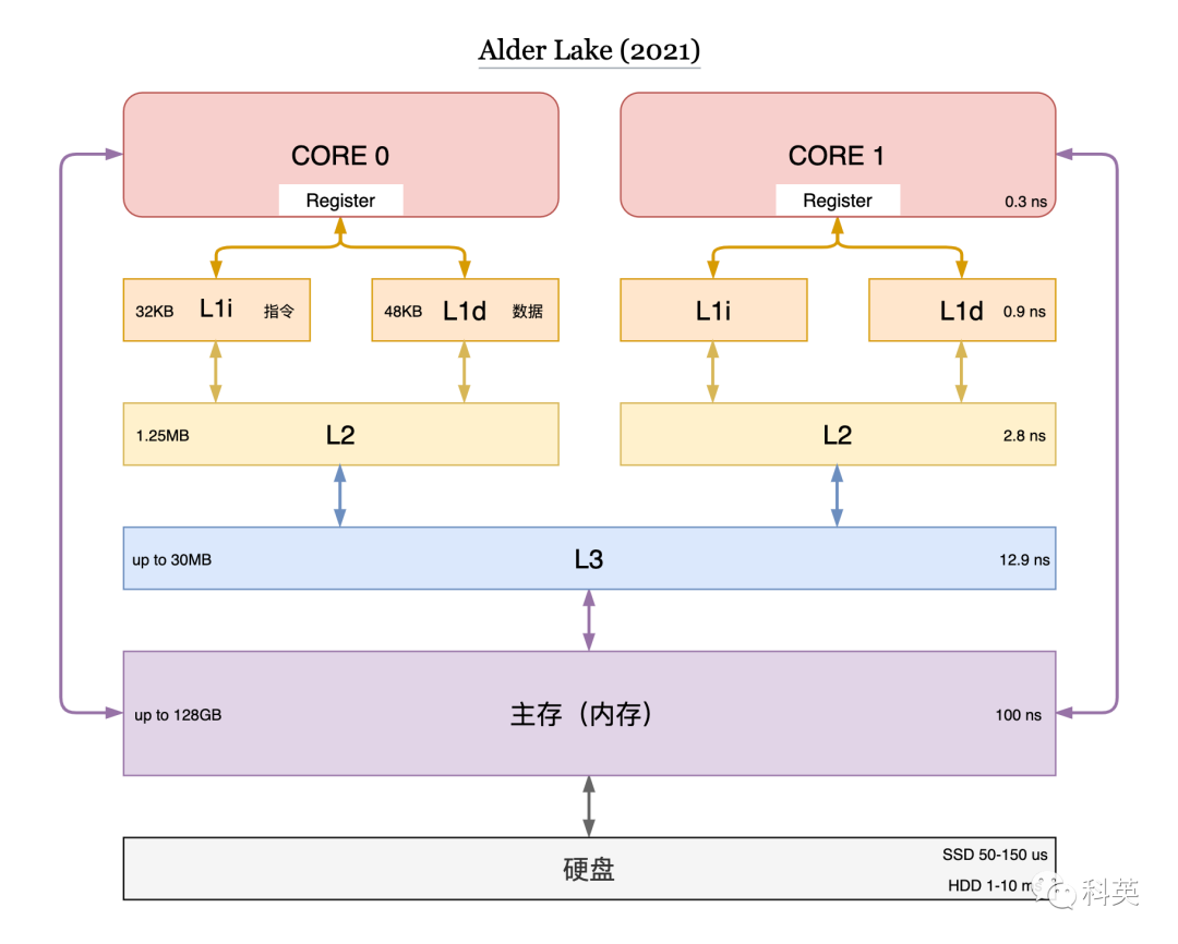 速度快的存储硬件成本高、容量小,速度慢的成本低、容量大。为了权衡成本和速度,计算机存储分了很多层次,扬长避短,有寄存器、L1cache、L2cache、L3cache、主存(内存)和硬盘等。图1展示了现代存储体系结构。