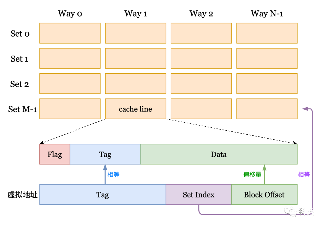 图2中,缓存是按照矩阵方式排列(M×N),横向是组(Set),纵向是路(Way)。每一个元素是缓存行(cacheline)。