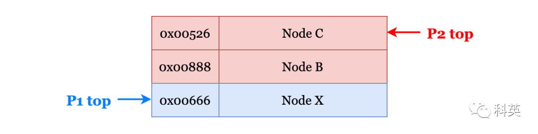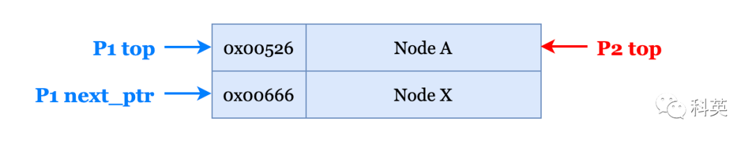 pop(){do{ptr=top;//ptr=top=NodeAnext_ptr=top-next;//next_ptr=NodeX}while(CAS(top,ptr,next_ptr)!=true);returnptr;}而线程P2在P1执行CAS操作之前把它打断了,并对栈进行了一系列的pop和push操作,使栈变为如下结构: