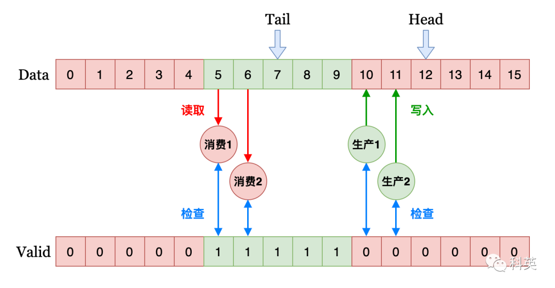 1、如图15,使用2个环形数组,数组元素均非原子变量,一个存储T范型数据(一般为指针),另一个是可用性检查数组(uint8_t)。Head是所有生产者的竞争标记,Tail是所有消费者的竞争标记。红色区表示待生产位置,绿色区表示待消费位置。