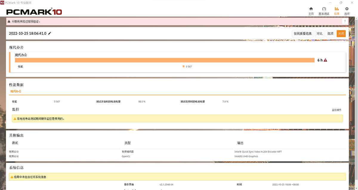 续航测试时,亮度调至50%,性能情景模式为省电,开启飞行模式,在PCMark10的现代办公续航测试中从98%电量到7%,神舟战神Z8-DA5NS取得了6小时的成绩,测试过程中的性能得分为5567,对于游戏本来说这个成绩是可以接受的。