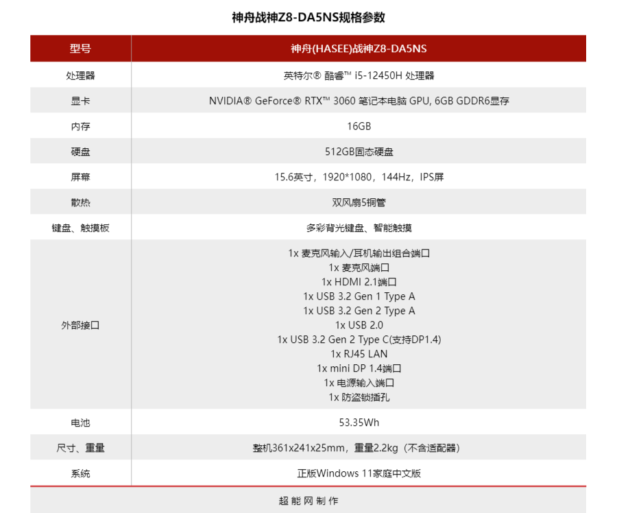 首先,这款神舟战神Z8-DA5NS的详细规格如下: