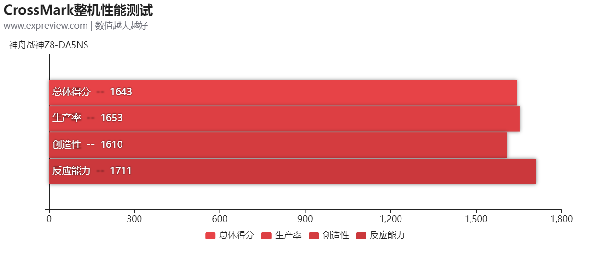 CrossMark理论性能测试能较为客观的反映出实际使用中的性能体验,它并不是全线程满载运行的测试,这与普通用户日常实际使用中的大部分时候情况相同,从测试可以看到战神Z8-DA5NS的各项分数都很不错,都能有很流畅的日常应用体验。