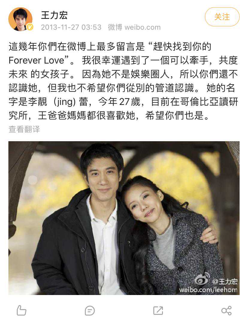 11月27,王力宏官宣来自哥大的李靓蕾↓