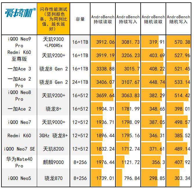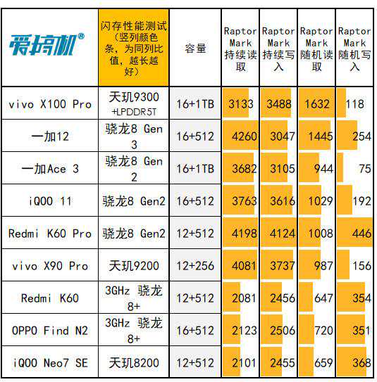 闪存读写性能(每一列,颜色条越长,越强)