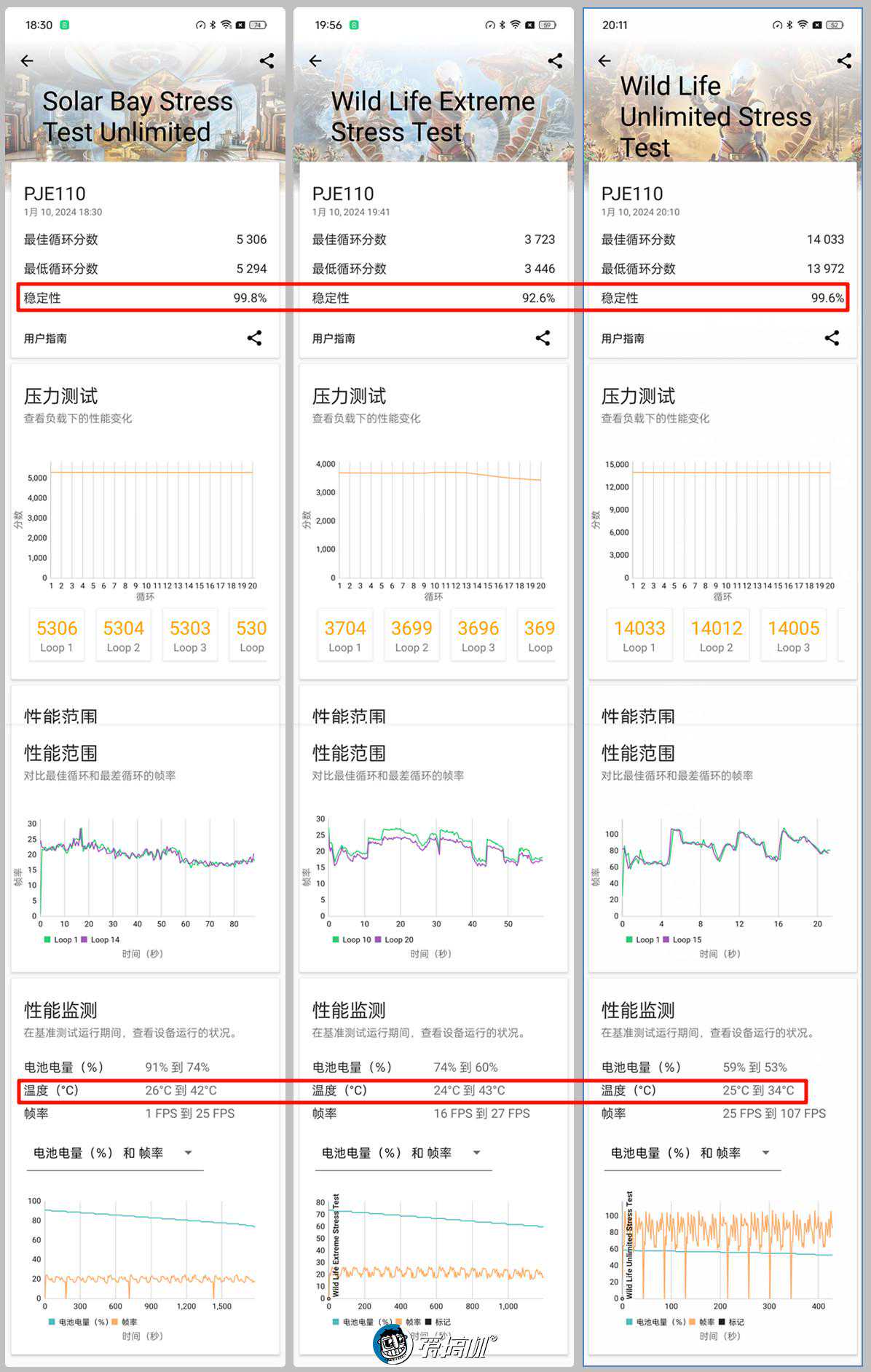 3DMarkWildLifeUlimited稳定度99.6%、ExtremeUlimited稳定度92.6%、SolarBay稳定度99.8%。