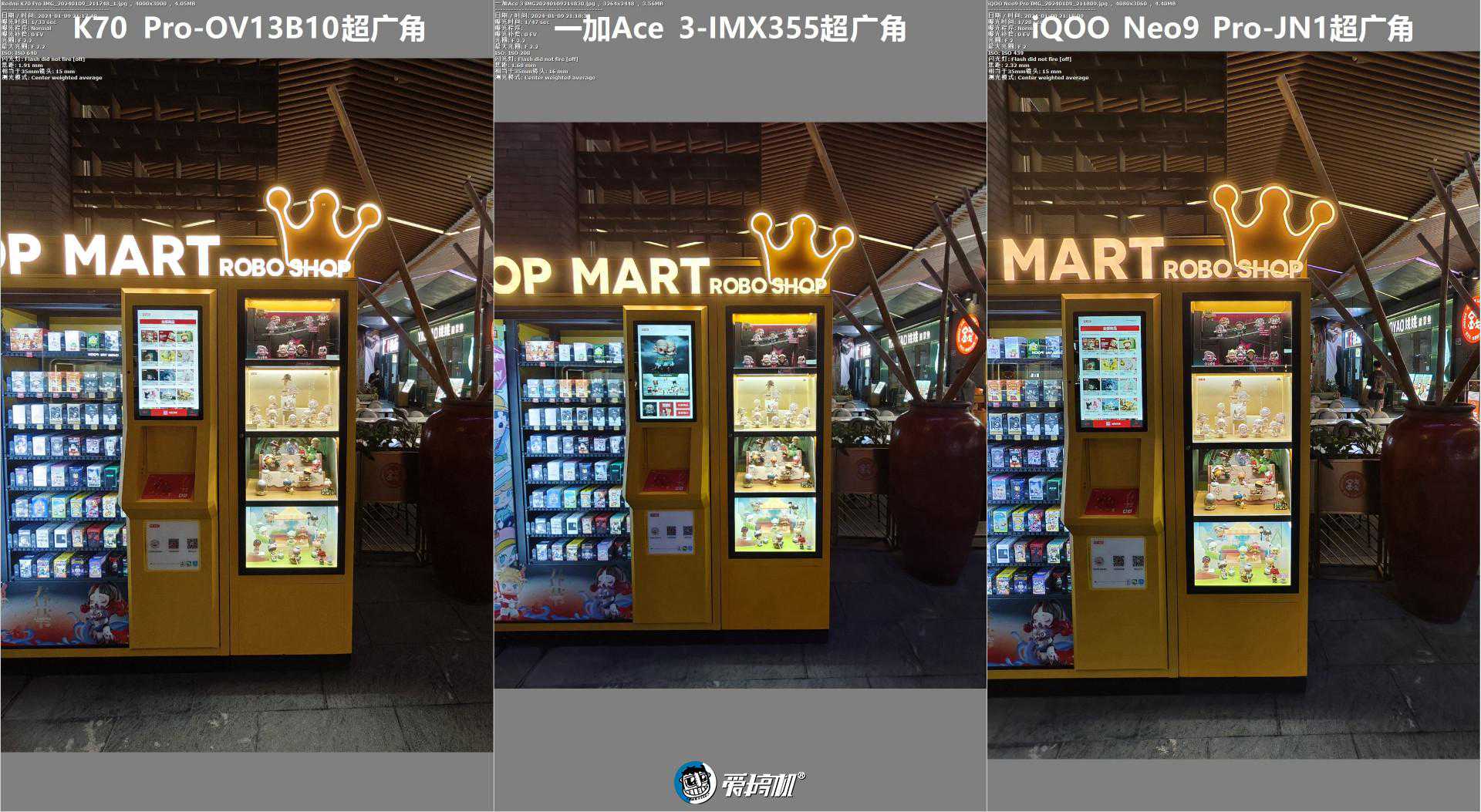 而超广角这边,一开始还以为标准版的800万像素战术超广角,和Pro版的正常超广角没有可比性。结果一加Ace3的超广角,弱光夜景竟然比K70Pro的1200万像素超广角强……