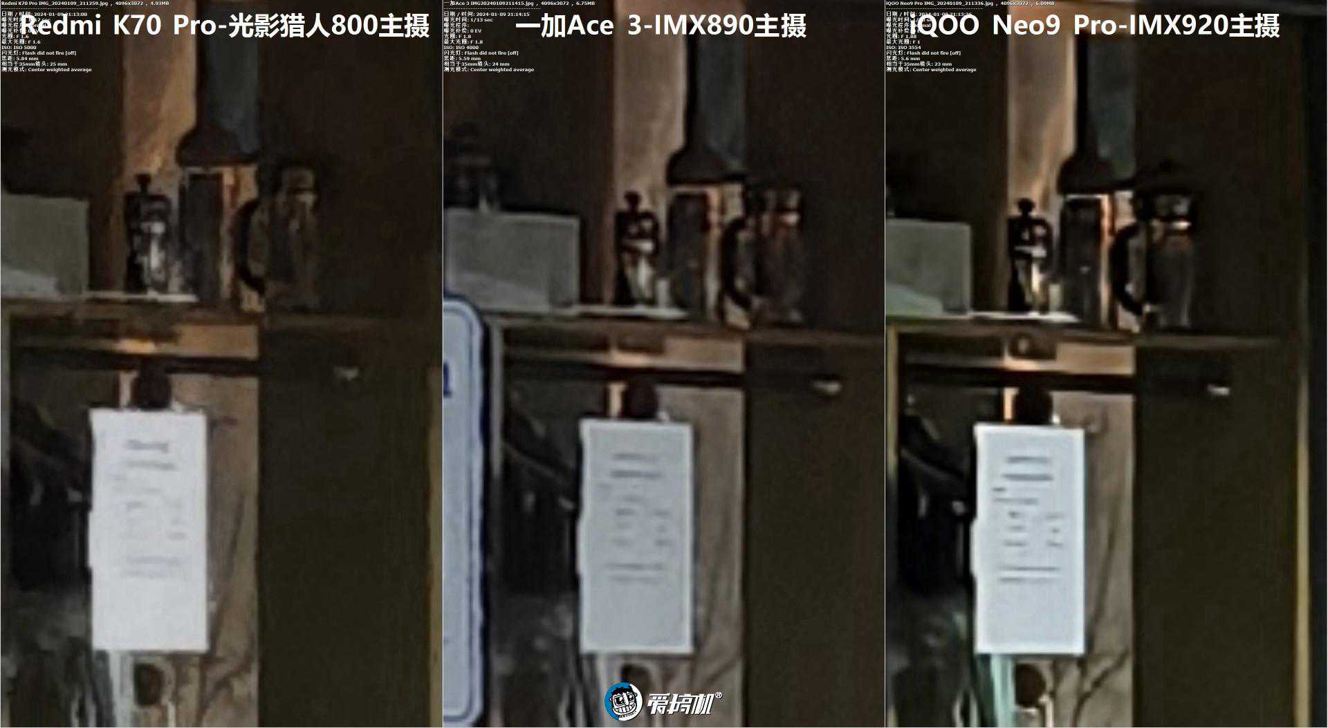 实际效果上看,一加Ace3主摄打不过K70Pro和iQOONeo9Pro,辨析力要弱一点,好消息是锐化力度相对较轻,OPPO/一加的夜景算法比Redmi强一点。