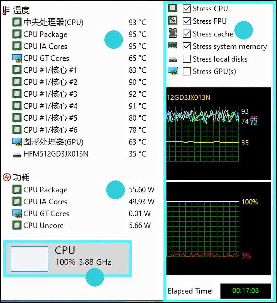 该机的第11代酷睿H45i511400H处理器,在持续单负载时(Aida64勾选前四项,最接近实际应用),爆发功率63W,后续缓慢走低,最后在55W~56W波动,频率稳定在3.9GHz左右,不同核心在78℃到95℃波动。注意,实际应用中处理器频率会更高,比如可高至4.06GHz。