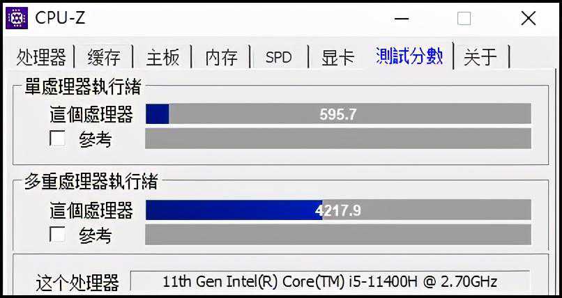 ▲CPU-Z基准测试,i511400H多核成绩4217.9分,比i710750H高出9.2%。若是功率相同,我们预计领先幅度可达13%。
