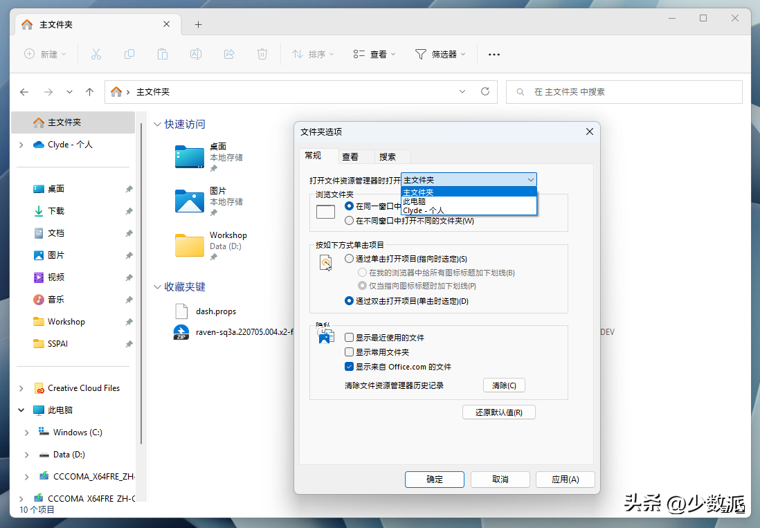 这里涉及到的改动是资源管理器「主文件夹」页面的引入,作为资源管理器新的默认启动页,主文件夹除了像以往那样提供快速访问、最近使用文件和常用文件夹外,现在还新增了一个名为「收藏夹键」的区域。