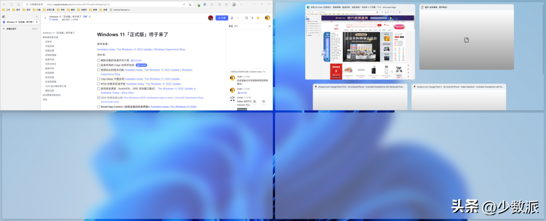 首先,和此前的多任务切换一样,贴靠布局在其中一个窗口完成贴靠时,其他窗口会依次出现在还没有窗口的贴靠区域中。而如果你使用的是Edge浏览器,那么Edge浏览器中的标签页此时也会以独立窗口的形式出现在建议区域,方便我们将多个浏览器标签页面同时排列在桌面上。