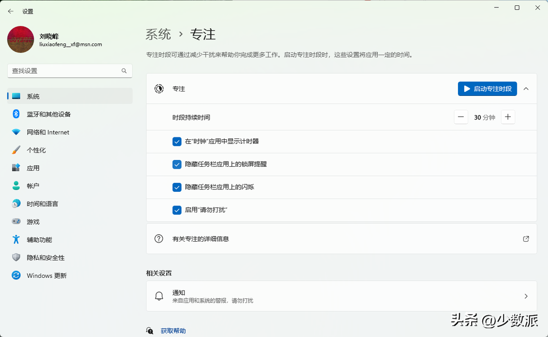 勿扰与专注早在Windows10中Microsoft就早早地引入了「专注助手」功能,但在那时相对死板的「专注助手」功能并不好用,既不能限定应用,也不能灵活开启。在22H2版本中Microsoft选择将原先的「专注助手」拆分为「勿扰」和「专注」两个功能。