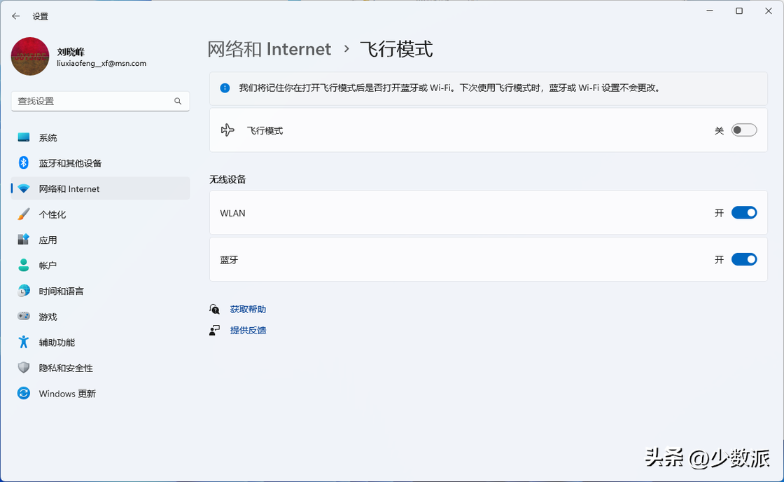最后,在22H2中的飞行模式也得到了一定程度的改进,新版飞行模式可以记住Wi-Fi以及蓝牙设置的打开状态,在打开飞行模式的开关以后,Wi-Fi以及蓝牙的状态不会发生改变。。