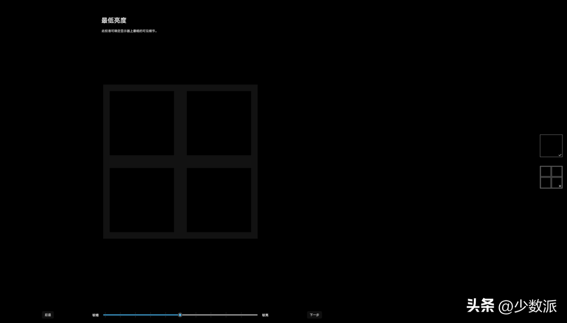 使用WindowsHDR校准工具的总体流程与Windows系统内提供的其他校准工具类似,应用会全屏运行,画面中央为主要调节对象,屏幕右侧则是正确与错误的图像参考。通过几轮简单的对比和设置,我们可以将显示器的HDR效果调节到最佳状态。