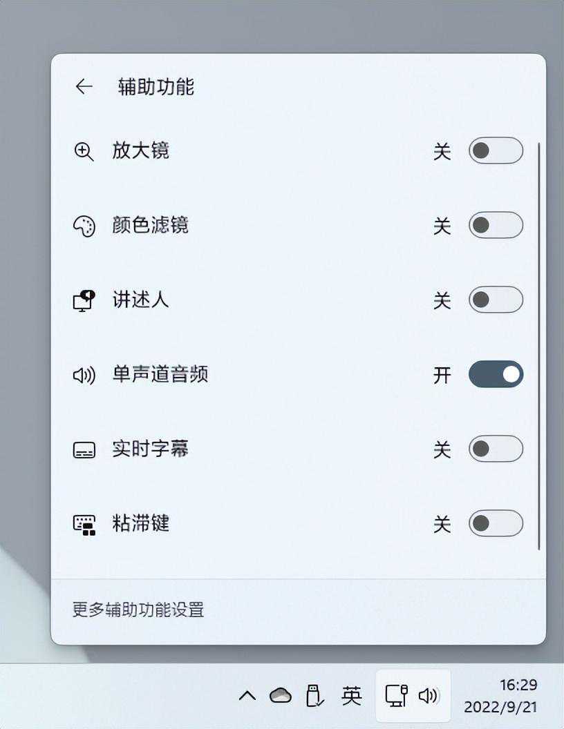 最后为了方便残障人士使用Windows上的辅助功能,Windows22H2还允许将辅助功能的面板添加到快速设置中,方便残障人士快速启用和关闭某些不需要长期开启的辅助功能。