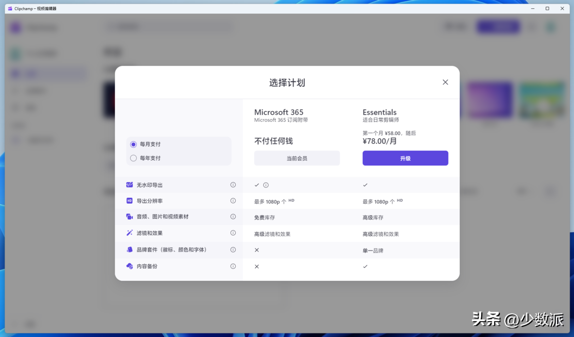 Clipchamp已经经历过数次调价,此前的免费版权益在22H2中被包装成为了Microsoft365订阅附带,付费版78元/月,在免费版的基础上可以获得更多在线素材以及品牌套件、内容备份功能。