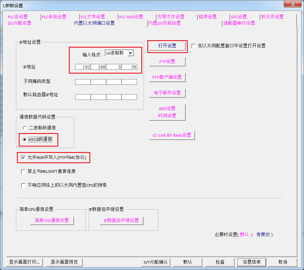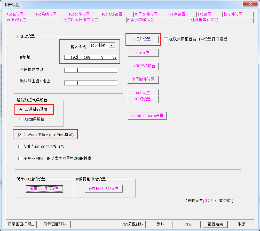 (1)在GXWorks2里,参数—PLC参数—内置以太网端口设置:输入格式选择10进制数,设置ip地址,如192.168.3.39