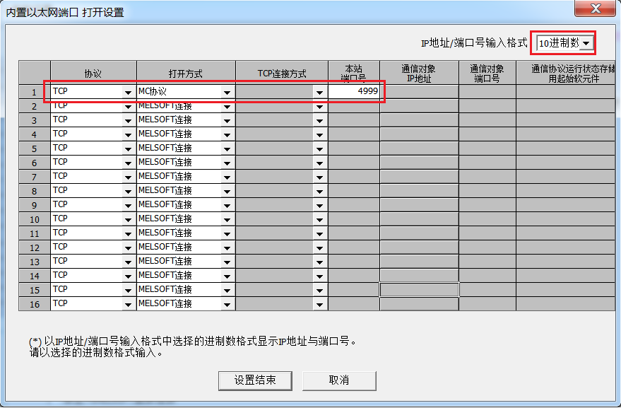 (2)再选择【打开设置】,在如下界面中设置,IP地址/端口号输入格式:10进制;协议:TCP;打开方式:MC协议;本站端口号:1025到4999,5010到65534.这里举例设置4999