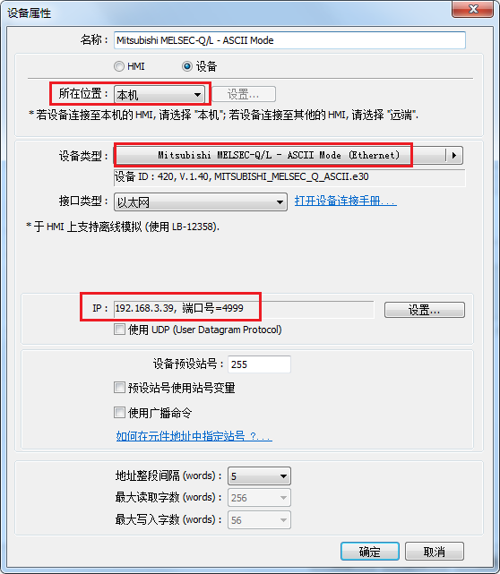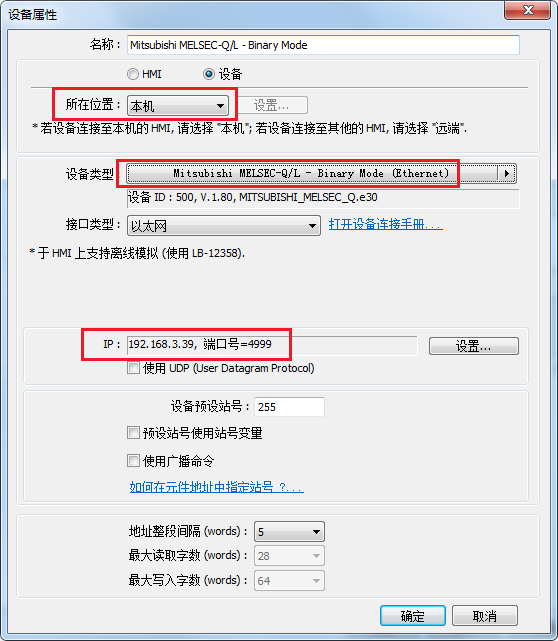 此驱动对应上述第(1)步B设置,所在位置:本机;ip填入.39,端口号默认4999,和PLC端设置保持一致