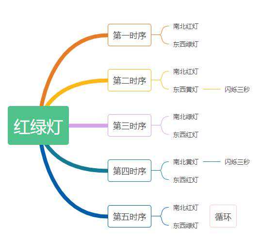 根据控制要求,把红绿灯按照先后顺序分为五个时序: