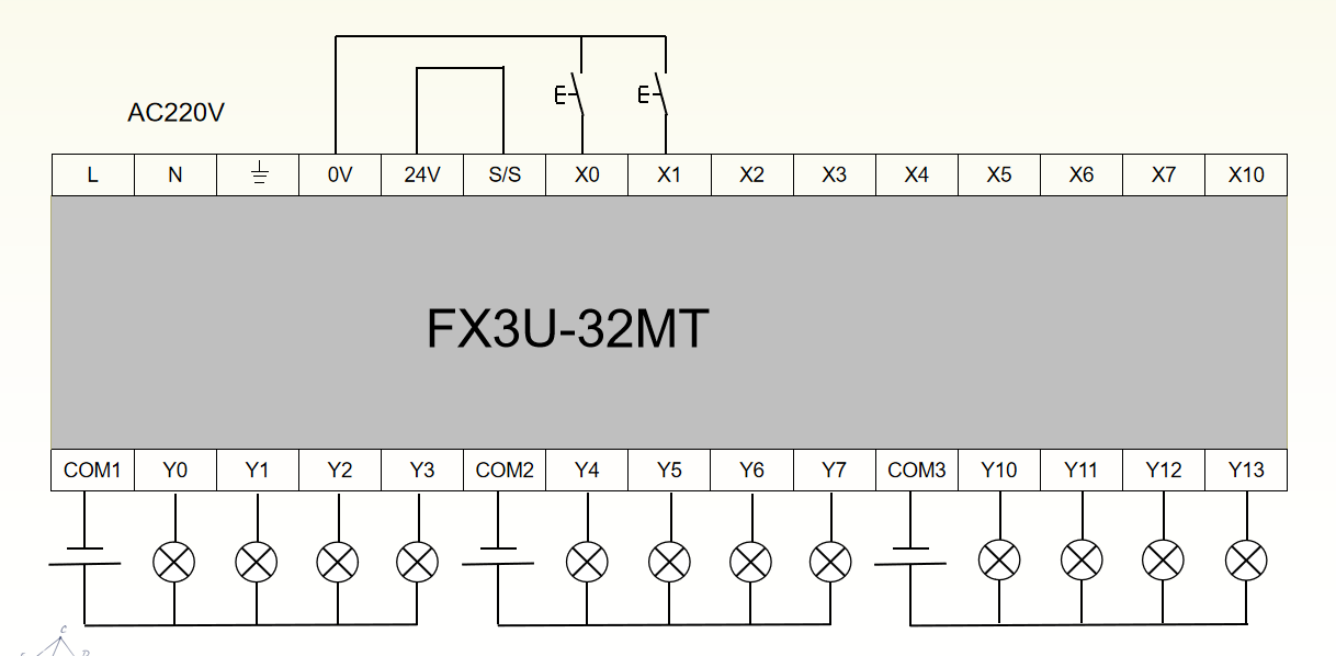 图中所示就是最终的接线图,因为输出为漏型,所以电源负极接入COM端,指示灯接入电源正极,但是3U为晶体管输出,所以只可以使用直流电压的指示灯,如果是交流指示灯,还需要使用中间继电器进行转换,这个一定要注意!